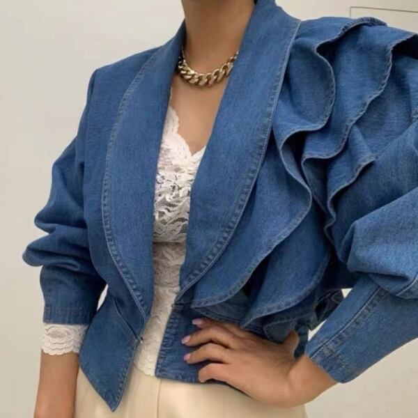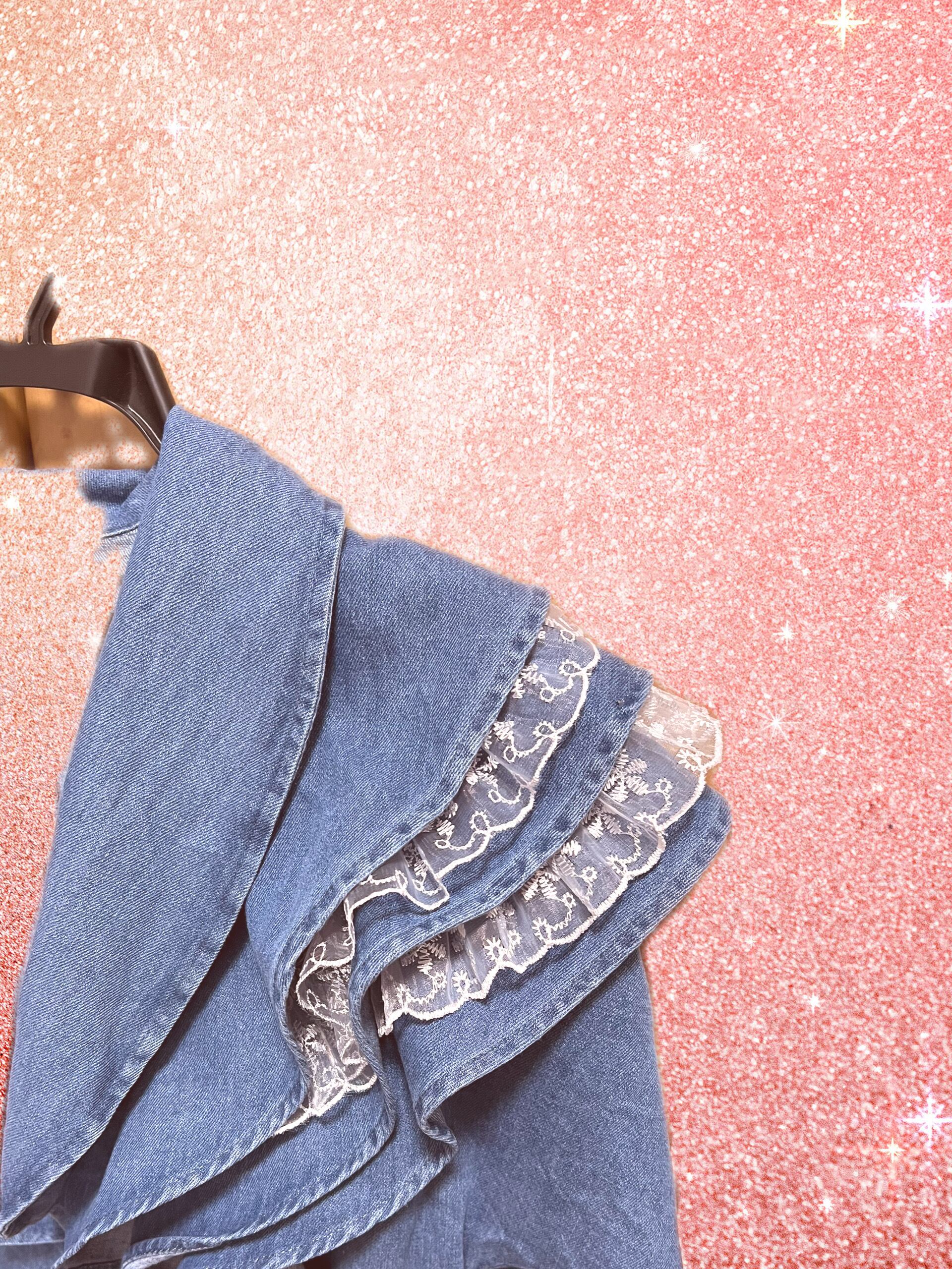 ブルーの綿ジャケット。 肩の部分部分にレースが付いています。(1点物です!!) ウェストがシェイプされた、女性らしいシルエットです。 カラー:ブルー サイズ:レディースM