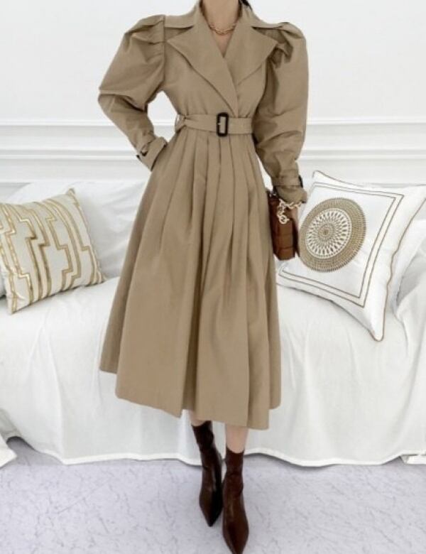 袖のデザインがかわいいコートワンピ。 1枚でも、上に羽織ってもOK! ドレープたっぷりで、足長効果あり。 カラー:ベージュ サイズ:レディースM